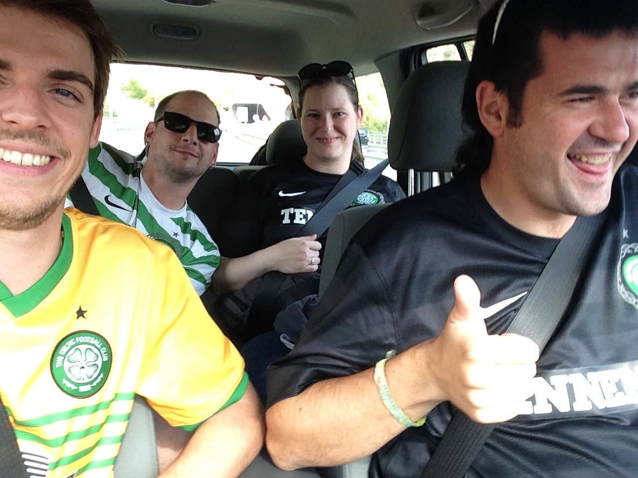 Markus, Fanny and myself started our wee 4 days trip on the 2nd of September with getting on train to Geneva Airport. There we hit the international roads with a shitty EasyShit flight to Barcelona. Spanish fenian Gonso picked us up with his new car at Barcelona’s airport and we drove about 3.5h to Villarreal where we had a first positive shocker. When we walked into our hotel the whole Celtic team was waiting in the lobby, what lead to a “fucking hell” shout by myself. The team wasn’t too happy about having supporters in their hotel and just gave us a wee wave. Kayal at least was ready to take a picture with me (see below).
