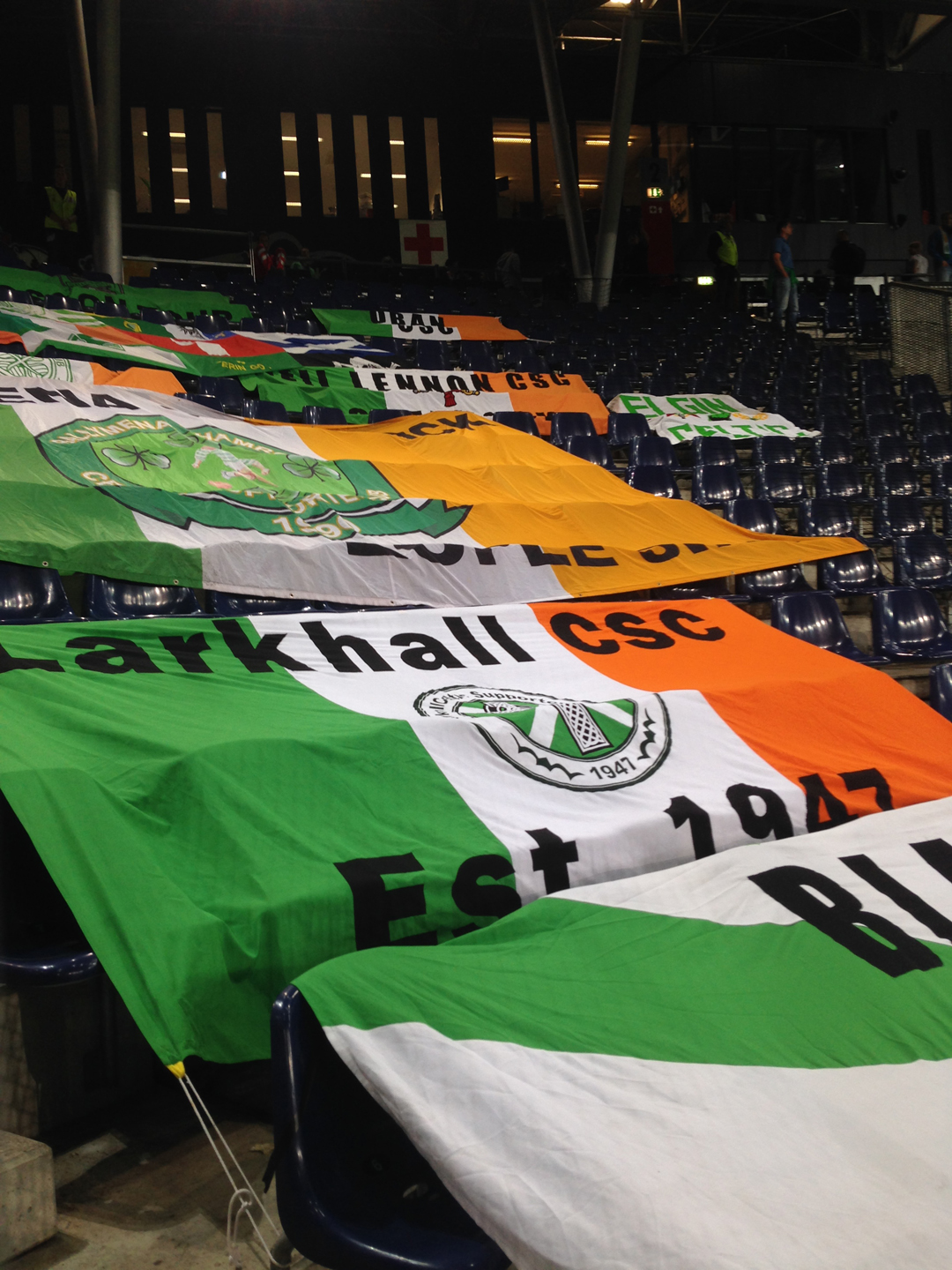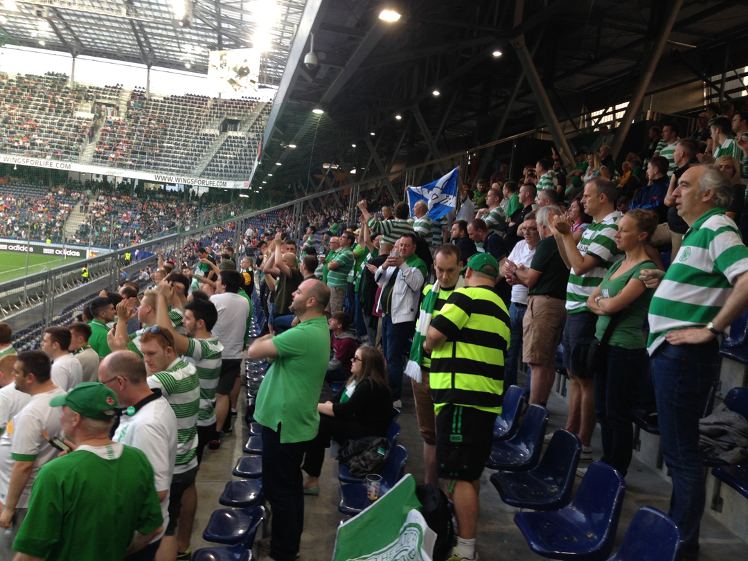 We started with an early train from Zurich HB on Thursday morning. After 5.5h we reached Salzburg and straight went to meet the other fans in the local irish Pub. To our suprise there were quite a few. We enjoyed the matchday athmosphere and around 6 p.m. we headed to the stadium where we met our friend Frannie to get our tickets. I then went directly to the stadium to put the banners up. The stewards were very nice and even helped me putting them on.